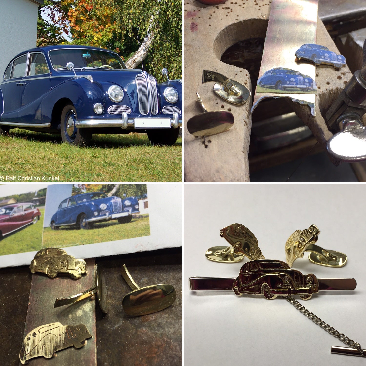 Bildet er et eksempel på gave til en bilinteressert onkel, et bilde av en veteranbil blir til mansjettknapper og slipsnål.